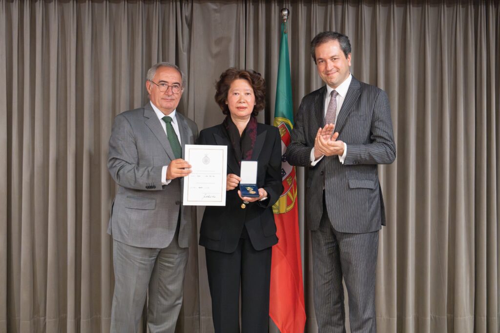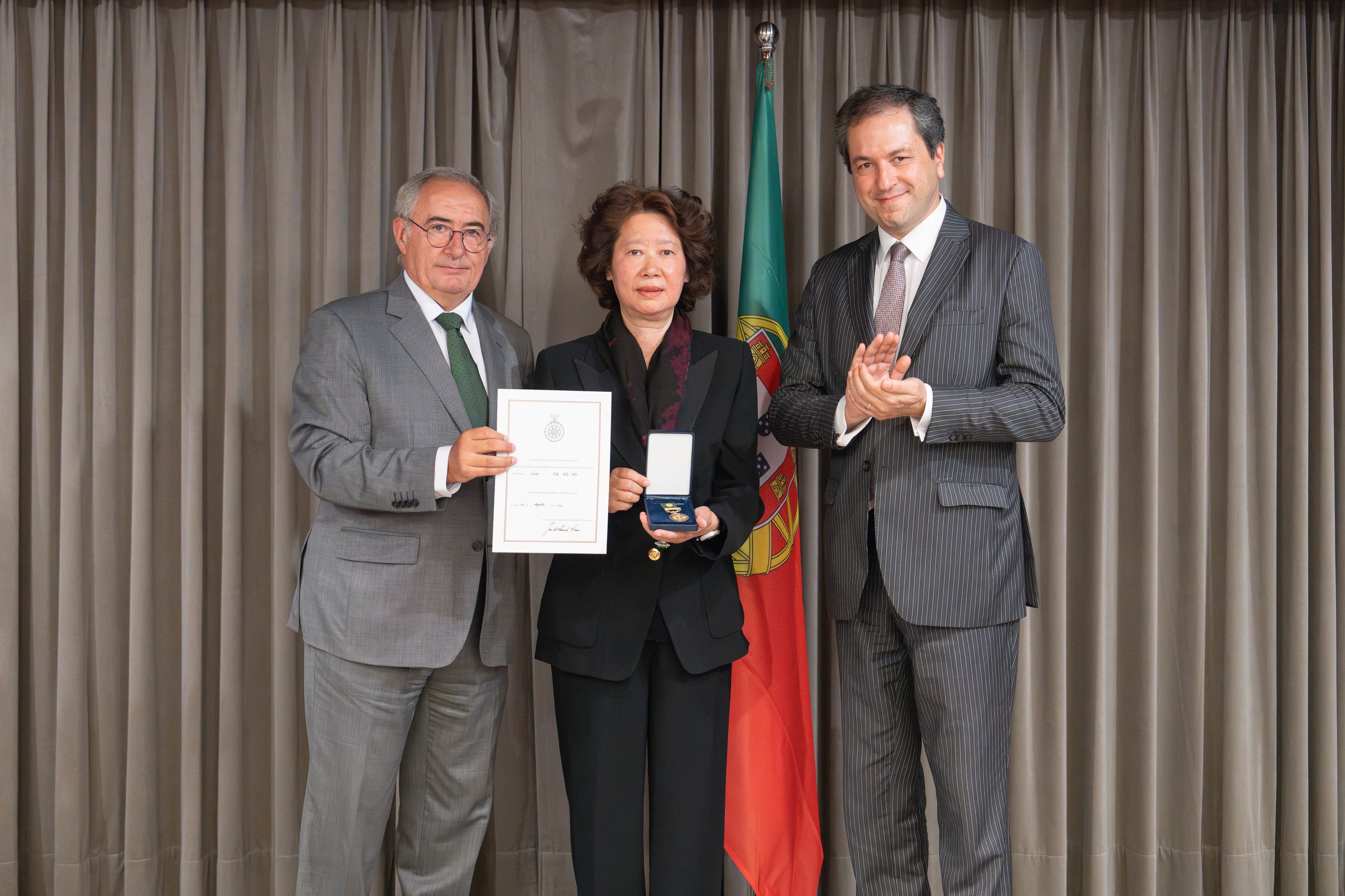(本报讯)8月27日下午,葡萄牙驻澳门领事馆举行隆重授勋仪式,由葡萄牙侨民事务国务秘书何塞.塞萨里奥(Dr. José Cesário)及葡萄牙驻澳门及香港总领事雷德生(Alexandre Leitão)代表葡萄牙政府向著名澳门企业家伍志伟颁授金荣誉勋章,伍志伟遗孀代表授勋,以表彰他在促进葡萄牙、葡语国家与澳门暨中国发展友好关系的学习榜样及所做出的卓越贡献。 出席嘉宾包括全国政协副主席何厚铧、澳门中联办协调部副部长王建峰及工商各界、葡侨各界知名人士、葡侨外交顾问等出席。仪式上,葡萄牙侨民事务国务秘书何塞.塞萨里奥(Dr. José Cesário)主持并致辞,高度赞扬伍志伟先生的卓越成就。 葡萄牙侨民事务国务秘书指出,伍志伟先生是一位成功的企业家和慈善家。多年来,他致力于葡语国家与中国的友好关系,是促进葡萄牙、葡语国家与澳门暨中国关系的真正推动者。他的聪慧远见和卓越贡献不仅影响深远,也将激励我们所有人继续为此奋斗。 葡萄牙侨民事务国务秘书回顾了伍志伟先生在推进葡语国家与中国、澳门经贸关系发展,以及促进葡中之间在语言、教育和文化领域的交流所做出的卓越贡献。多年来,伍志伟先生积极支持东方葡萄牙学会在澳门、北京等地开展葡语培训工作,并推动促成学会开设中文课程,为推动葡中之间语言、文化的双向交流。此外,他还协助葡萄牙驻华大使馆、驻澳门领事馆,将有关葡萄牙历史文化方面的著作和葡语教材翻译成中文,助力葡语和葡萄牙文化在中国介绍传播。国务秘书强调,这些成果和成就将会被永远铭记! 伍志伟先生作为澳门著名实业家和工商界代表性人物,亦是葡萄牙中国华侨华人的著名侨领。他以卓越才干和诚实敬业工作热忱,赢得葡中两国工商各界和葡萄牙旅葡华人侨联的高度赞誉,曾被推选为澳门特别行政区第四、五届行政长官选举委员会委员,并担任安徽省政协常委、澳门中华总商会监事、澳门安徽联谊总会理事长、澳门安徽商会会长,以及葡语国家共同体企业联合会首任驻中国代表、葡萄牙葡中工商会副主席、中国-葡萄牙商会副主席、英国伦敦华埠商会荣誉会长等职。他为推动澳门社会经济发展及国家“一带一路”战略做出积极贡献,受到国内外政商各界广泛好评和尊重。 国务秘书特别指出:伍志伟先生在十多年前在葡萄牙里斯本阿伦克尔市的密利拿庄园(Quinta da Marmeleira)投资创办经营绿色葡萄产业,成为杰出的葡萄酒生产基地,并大量出口到澳门、中国内地及海外市场。显著地推动了当地经济和公共事业发展,他的宏大愿景正在持续向前迈进。 伍志伟的遗孀及家族,将继承伍志伟的事业,继续为促进葡中两国经贸、文化和教育等领域交流合作,积极推进葡中两国人民之间交流交往做出新的贡献。
